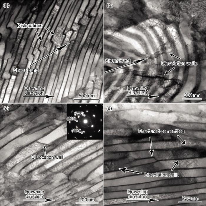 冷拔珠光体钢丝因其具有高强度的同时仍保持一定的韧性, 被广泛应用于子午线轮胎、大桥缆索等重要领域[1-4]. 珠光体钢丝的高强度是由冷拉拔形变而获得. 目前, 商用切割细钢丝最高等级已达到3800 MPa, 随着硬质材料切割行业需求的增加、材料制备技术的发展, 更高强度级别的珠光体钢丝正在研制之中, 据报道[5], 实验室制备的珠光体钢丝样品最高强度已经达到7 GPa.