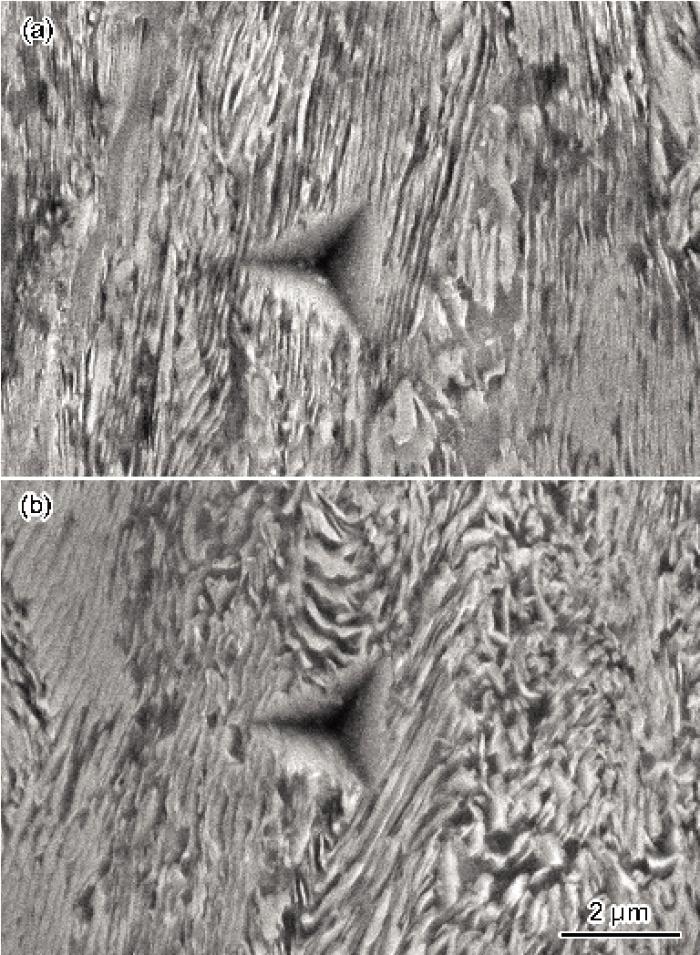 Fig.4 SEM images of pearlite steel wire with straight (a) and bent (b) lamella at strain of 1.1 after nano-indentation