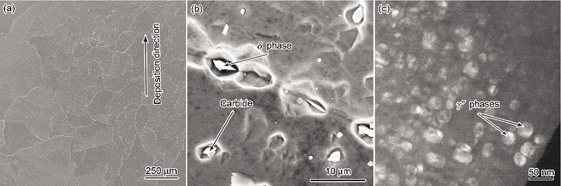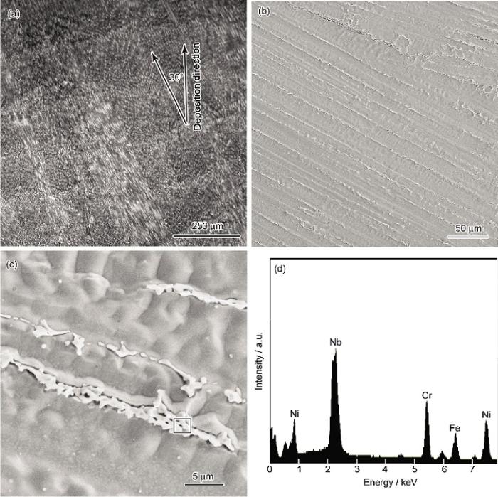 图1所示为激光立体成形Inconel 718合金沉积态的显微组织. 由图1a可见, 组织呈现穿越多层熔覆沉积层的外延生长柱状枝晶, 柱状晶粒的宽度约为200 mm, 生长取向性较强, 倾向趋于沉积方向生长, 柱状晶生长方向与沉积方向之间的夹角大约为30°. 由于本工作所采用的基材为多晶材料, 取向随机, 而激光熔池底部的温度梯度最大, 并倾向于沉积方向, 使得自基材外延生长的柱状晶通过竞争淘汰, 其中生长方向与沉积方向较为接近的柱状晶生长最终占优. 由于激光熔凝的高凝固速率, 柱状晶中的树枝晶一次枝晶间距约为5~10 mm (图1b). 此外, 在枝晶间区域还存在一些不规则的颗粒(图1c), 由EDS分析可知, 该颗粒中存在严重的Nb元素偏析(图1d), 因而推断该相为Laves相.