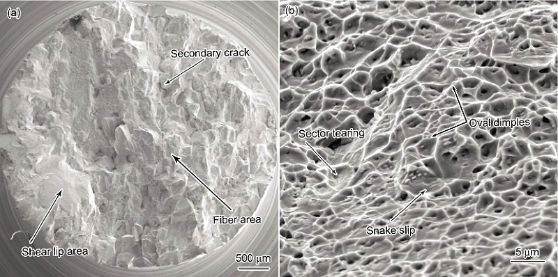 Fig.4 Tensile fracture morphologies of LSF Inconel 718 alloy after heat treatment at low (a) and high (b) magnification