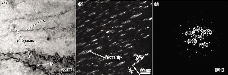激光立体成形Inconel 718合金经过热处理后, 沿晶界析出了细小的d相, 晶内则呈现弥散分布的细小g" 相. 对于此类沉淀强化高温合金, 其力学性能与该合金中的第二相密切相关, 而第二相与位错的相互作用则反映了该合金的强化机制. 因此, 若要明晰经热处理后激光立体成形Inconel 718合金的强化机制, 对其拉伸断裂后的位错组态进行研究十分必要.