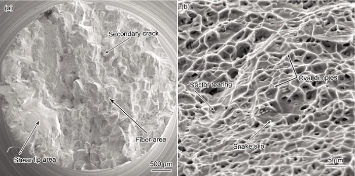 (3) 合金热处理态拉伸断口只有纤维区和剪切唇2个部分, 在断口纤维区存在很多以g" 相为基底的韧窝, 在某些韧窝内部能观察到蛇形花样以及扇形花样. 此外, 在某些韧窝的撕裂棱上存在细小的卵形韧窝.