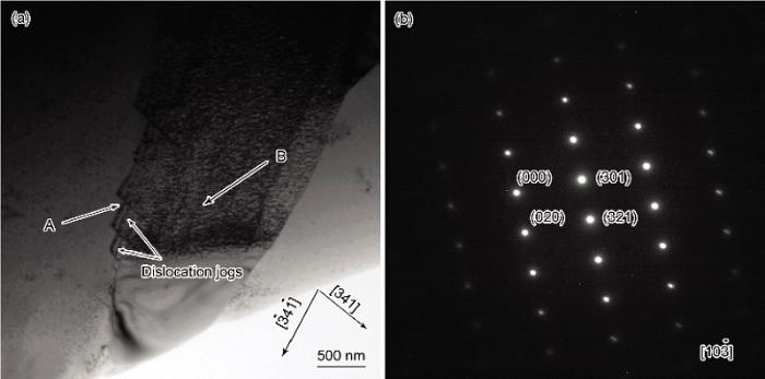 在传统的锻造Inconel 718合金中, d相通常为细长针状, 宽度大约为100 nm, 因此, 锻造Inconel 718合金中d相往往容易在位错运动的过程中被切断. 然而, 激光立体成形 Inconel 718合金经热处理后, d相为短棒状, 宽度大约为1 mm, 因此, 位错更容易在d相处发生塞积, 进而阻碍位错的运动. 在热处理后的Inconel 718合金中, 可以看到在d相边缘, d相被位错切割并形成滑移台阶(图6a中A区域), 使d相界面增大, 增加界面能, 这也意味着, 位错切过d相后, 有可能会造成d相原子错排, 增加错排能. 在图6a中A区域, 滑移方向为[341]的位错切割d相时, 2条相邻位错线之间的距离逐渐增大, 这是由Burgers矢量相同的位错之间存在排斥作用所导致的. 当位错在d相处塞积时, 领先的位错首先到达d相处, 而后来的位错则因为排斥力的作用排列的越来越稀疏[26]. 此外, 在图6a中还能观察到, 滑移方向为[