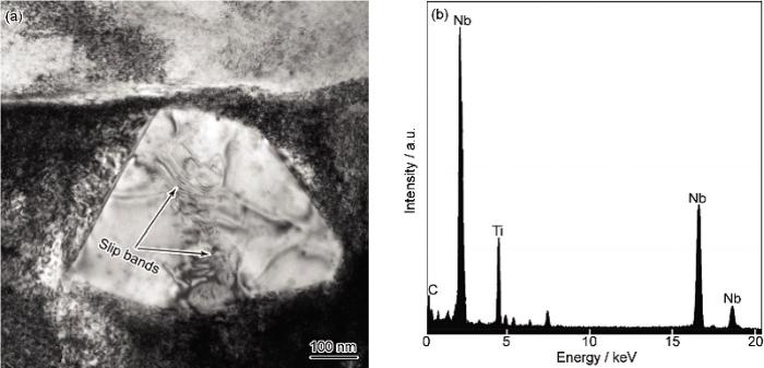 2.3.3 碳化物 除了g"和d相, 碳化物也是激光立体成形 Inconel 718合金经过热处理后较为常见的相. Liu等[27]研究认为, 位错能在碳化物处缠绕, 从而阻碍位错的运动, 并且它还能提高位错对强化相的剪切抗力, 从而提高合金强度. He等[28]也认为, 碳化物和位错之间存在强烈的相互作用, 能通过钉扎和拖曳作用来阻碍位错运动. 图7a是热处理态激光立体成形 Inconel 718合金中的碳化物的TEM明场像. 由图可见, 该相边界较为平齐, 呈现出块状. 由图7b所示的EDS分析显示, 该相中Ti和Nb的含量比较高, 因此断定该相为碳化物(Ti, Nb)C. 从形貌上观察, 碳化物内部同样有被位错切割的痕迹, 此外, 在图7a中还能观察到滑移带, 表明位错在碳化物内部发生塞积.