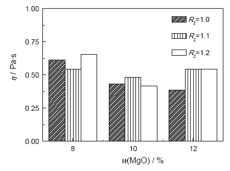 2. 碱度、w(MgO)对炉渣的黏度都有一定的影响, 低碱度条件下, 随着w(MgO)增加, 炉渣黏度逐渐减小, 在碱度、w(MgO)协同影响作用下, 炉渣黏度在0.38-0.65 Pas之间波动。