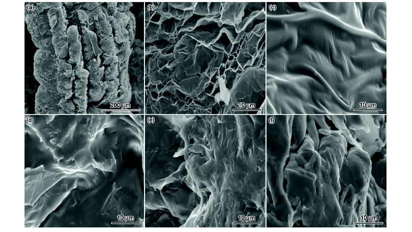 Fig.1 SEM images of EG (a) and EG (b) and composite phase change materials of 5% EG (c) and 10% EG (d) and 15% EG (e) and 20% EG (f)