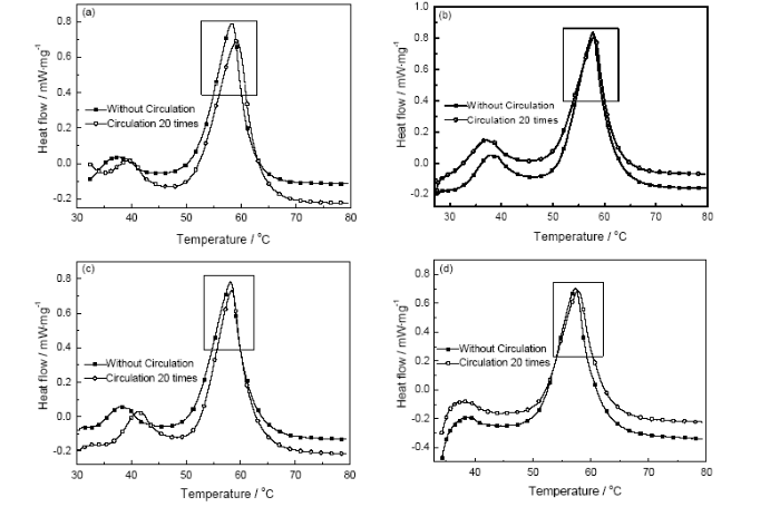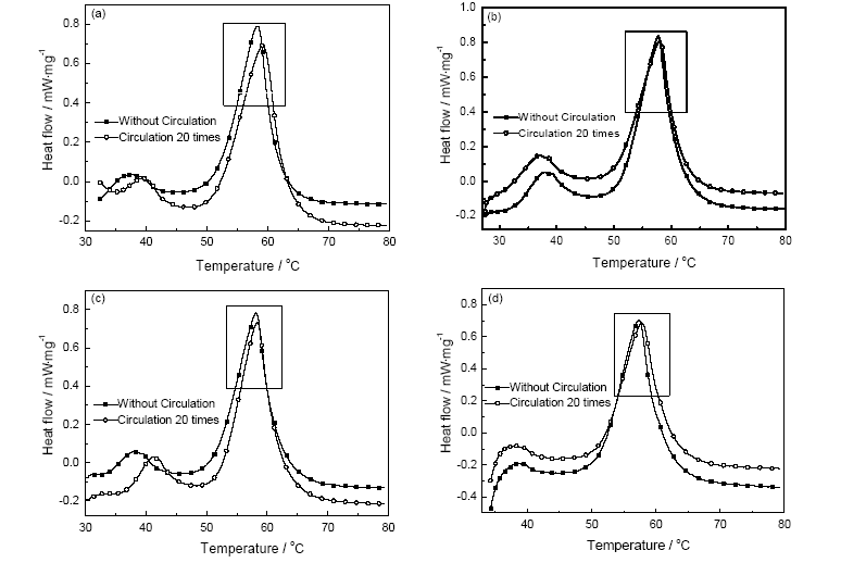 Fig.10 Effect of heat and cooling cycle on latent heat of composite phase change materials of 5% EG (a) and 10% EG (b) and 15% EG (c) and 20% EG (d)