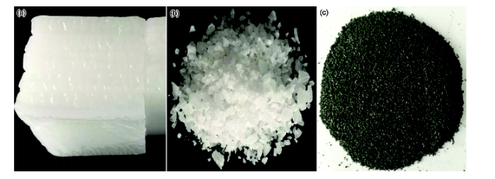 Fig.2 The photographs of scale paraffin (a) and particle paraffin (b) and composite phase change materials of 10% EG (c)