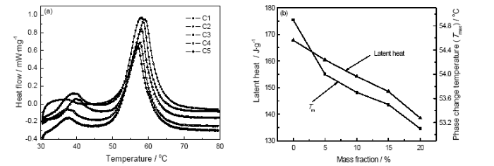 Fig.3 DSC curves of composite phase change materials (a) and latent heat and phase change temperature (b)