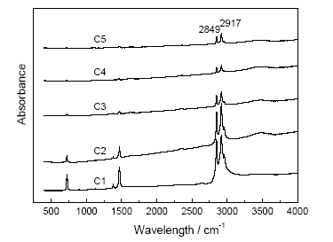 2.3.1 红外光谱分析 图4为复合相变材料的红外光谱, 通过对光谱图的分析可知, 2917 cm-1吸收峰为CH2基团的C-H反对称伸缩振动吸收谱带; 2849 cm-1处为亚甲基的C-H键的伸缩振动吸收峰; 1461 cm-1为CH3和CH2基团的C-H面内弯曲振动吸收谱带; 720 cm-1处为亚甲基的面内摇摆振动吸收峰。比较可知, 各组复合相变材料红外图谱出峰位置和峰形几乎无变化, 只是发生峰高的变化, 表明复合相变材料中没有新官能团的产生, 仅是官能团的含量发生变化, 说明石蜡和EG间仅为物理插层或嵌合关系, 两者之间主要是分子间作用力, 没有发生化学反应导致新的物质生成, 保持了各自的优良性能。