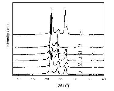 Fig.5 XRD spectra of EG, paraffin and composite phase change materials