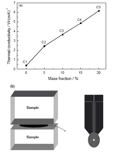 Fig.6 The thermal conductivity curves of composite phase change materials (a) and sketch map of thermal conductivity test (b)
