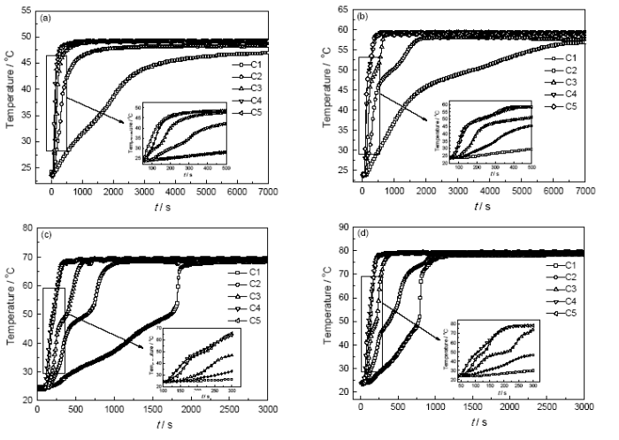 复合相变材料的蓄热性能采用RC-4温度记录仪测定: 将等体积的C1、C2、C3、C4、C5共5种样品加热软化后分别装入内径31 mm的铜质试管中, 将温度传感器探头插入到试管内样品中心处, 样品冷却后将室温下的5支装有试样的铜质试管置于不同温度的恒温水浴槽中, 样品中心温度的变化用温度记录仪进行动态检测, 数据采集间隔为10 s。
