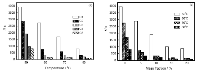 2.4.3 温度对相变蓄热过程的影响 图8是不同温度、不同EG质量分数的复合相变材料完全相变成液态时所需时间柱状图。对比图6与图7可知, 当温度较低时(温度为50℃), 复合相变材料中EG含量较低时(质量分数为5%), 继续增加EG含量对复合相变材料蓄热所需的时间影响不大; 但是温度较高时(温度为80℃)增加EG质量分数对复合相变材料蓄热所需时间影响明显。为了进一步揭示温度对复合相变材料蓄热过程的影响, 根据相变材料无流动焓方程[10]: