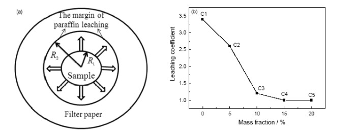 Fig.9 Diagram of infusion paraffin in the composite phase change material (a) and the effect of EG content on the leaching coefficient (b)