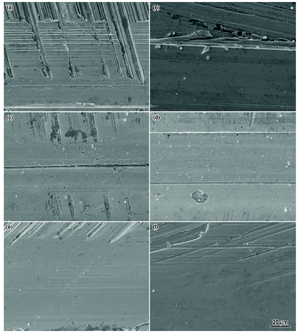 Fig.5 Wear surface morphology of T10 steel samples with various grain sizes after tested under normal loads 70 N, (a), (b) 32 μm; (c), (d) 12 μm; (e), (f) 5μm