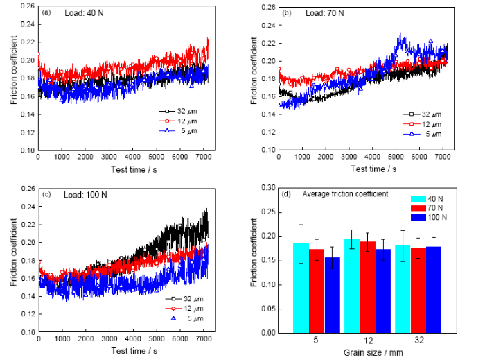 Fig.2 Friction coefficient as a function of test time (a)positive pressure 40 N,(b) positive pressure 70 N, (c) positive pressure 100 N, (d) average friction coefficient