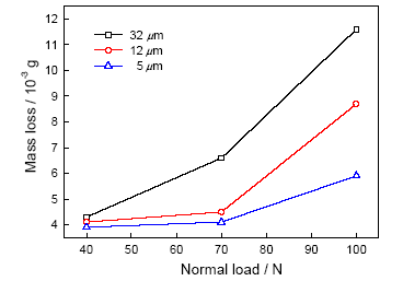 Fig.3 Wear loss of T10 steel samples with various grain sizes as a function of normal load