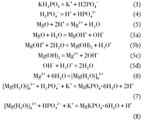 MKPC的水化产物是由M、K和B三种组分通过一系列的反应生成。MKPC体系内的主要水化反应[26]为