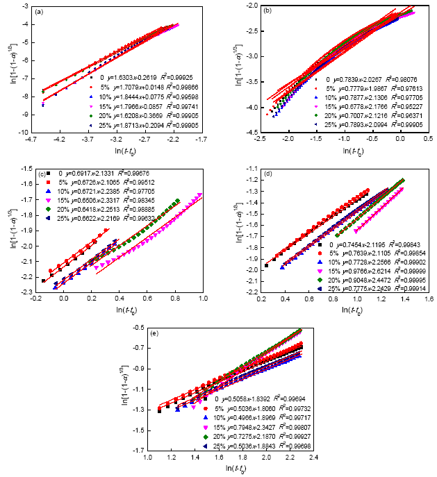 图4给出了Kondo的水化动力学公式对MKPC水化阶段II-阶段VI的拟合效果图。可以看到,Kondo的水化动力学公式对于MKPC水化各阶段有良好的适用性,拟合相关系数R几乎都在0.99以上。