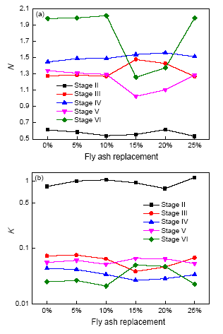 Fig.5 Kinetic factors of hydration process of MKPC with different fly ash replacement (a) Kinetic factors K; (b) Kinetic factors N