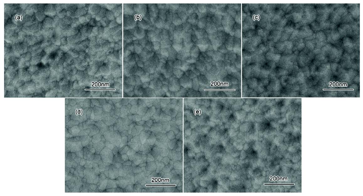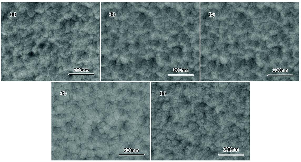 Fig.1 SEM of AZO films annealed at different oxygen partial pressure (a) unannealed; (b) 4.2×10-2 Pa; (c) 3.2×10-3 Pa; (d) 2.5×10-4 Pa; (e)3.2×10-5 Pa