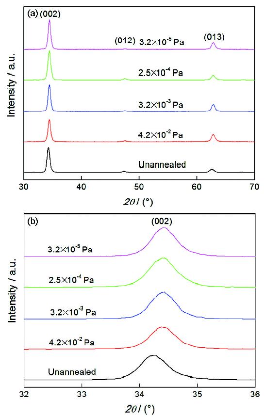 图2 在不同氧分压下退火的AZO薄膜的X射线衍射谱