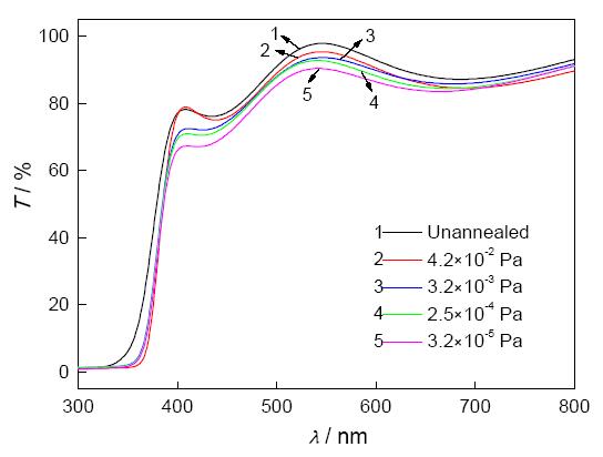图3 在不同氧分压下退火的薄膜的透射光谱
