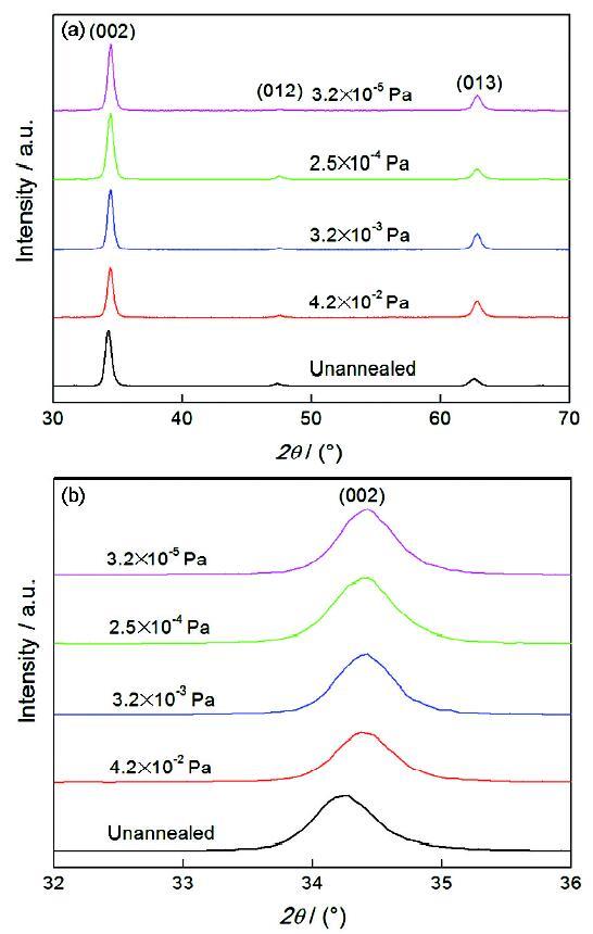 2.1.2 AZO薄膜的结构 图2给出了AZO薄膜在不同氧分压下退火的XRD图,可见AZO具有ZnO典型的六角纤锌矿结构[12]。在所有样品的谱中都出现了较强的(002)衍射峰表现出较强的c轴择优取向,薄膜内的晶粒倾向于沿着(002)轴柱状生长。随着氧分压的降低退火样品的(002)衍射峰峰位由未退火时的34.25°偏移至34.45°、34.40°、34.37°、34.32°,均向大角度方向偏移。其原因是,退火使薄膜内的位错和堆垛层错减少,并且退火气氛中的氧在一定程度上与氧空位复合,薄膜内点缺陷减少使薄膜内应力降低和晶格完整度提高。而随着氧分压的降低峰位向小角发生偏移,因为AZO中的氧脱离晶格的速度大于退火气氛中的氧进入的速度,氧空位缺陷增加使衍射峰向小角度偏移。