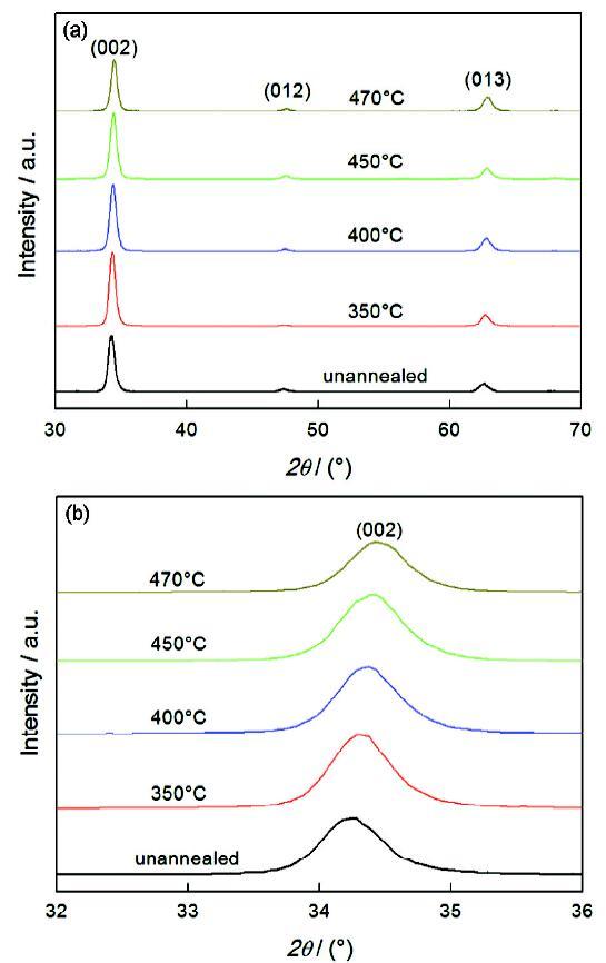 Fig.5 XRD patterns of AZO films annealed at different temperatures (a) in a wide range of angles; (b) (002) peaks in detail