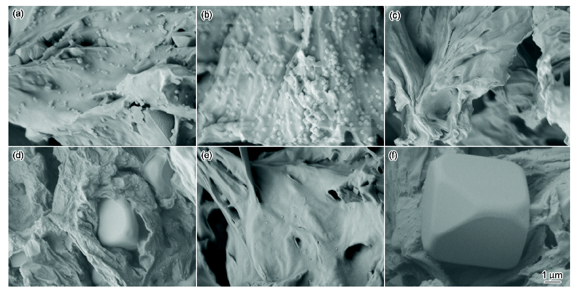 Fig.4 Scanning electron micrographs of the PCL /ASA composites immersed in SBF with 7~14 d (a) 7 d, 0 ASA; (b) 7 d, 5% ASA; (c) 7 d, 10% ASA; (d) 7 d, 15% ASA; (e) 14 d, 0 ASA; (f) 14 d, 5% ASA