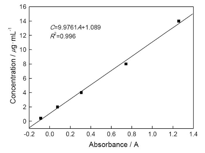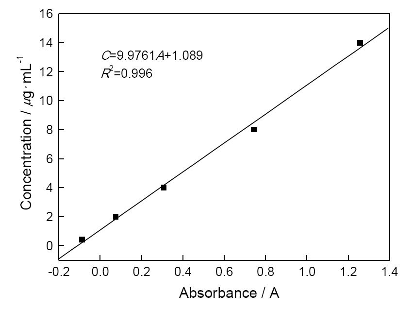 2.5.1 阿司匹林标准曲线方程 浓度分别为0.4、2、4、8、14 μg/mL的ASA溶液,在λ=202 nm处的吸光度值分别为:-0.087、0.076、0.308、0.745、1.259。图6为将浓度(C)对吸光度(A)进行回归所得的结果,可得ASA的标准曲线方程为C=9.9761A+1.089,且R2=0.996,接近于1,表明该回归有较好的拟合结果。