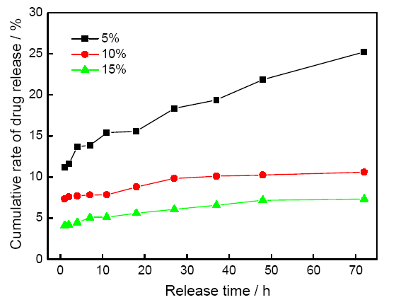 2.5.2 ASA含量对PCL/ASA复合材料的药物缓释性能的影响 由图7可见,随着ASA含量的提高,PCL/ASA复合材料累积释药百分率减少。以释放72 h为例,ASA含量为5%的样品累积释药率为25.23%,ASA含量为10%时为10.61%,ASA含量为15%时则为7.33%;另外,随着释放时间的增加,ASA含量为5%的样品在前18 h的释放过程累积释药率的变化幅度不大,但是过了18 h后其释放率有较明显的增加;ASA含量为10%和15%的样品在实验时间内的累积释药率的变化幅度不大。苏瑛杰等[2]和蒋岩岩等[16]分别用PVA/淀粉和PLA/SF作为阿司匹林的释药载体,均得到载药量越大则药物的释放速率和释放量越大的结论。但是本实验却没有得到相同结论,可能与复合材料的具体结构有关。由上面不同ASA含量的PCL/ASA复合材料的电镜图分析可知,ASA含量为5%的PCL/ASA复合材料的基体结构由近于纳米的微米级纤维结构构成,而ASA含量为10%和15%的PCL/ASA复合材料的结构则由非纤维结构构成。这说明,ASA含量为5%的PCL/ASA复合材料的基体结构可能属于载药缓释的纳米系统范围1~1000 nm[21],因此具有较大的比表面积。药物释放一般是先从载体的表面或者是与载体结合较松散的部分开始释放的[16],因此ASA含量为5%的PCL/ASA复合材料所具有的结构更有利于ASA的释放。而ASA含量为10%比15%的累积释放量大,应该也与结构有关。从电镜图(图2f, h)可以看出ASA含量为10%的样品虽然不是纳米纤维结构,但其组成为片状结构堆叠而成,而ASA含量为15%的样品则是密实的结构。故ASA含量为10%样品中ASA与外界的接触面积更大,更有利于ASA的释放。ASA含量为5%的样品后期的累积释放率提高,则可能与浸泡后期载体的骨架松散降解等因素有关。