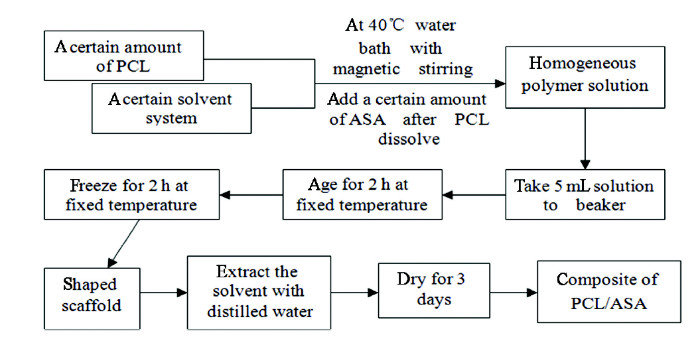 将适量的PCL溶解在1,4-二氧六环/水(质量比为90:10)的混合溶剂体系中配成10%(质量比)的PCL溶液,再将一定比例的阿司匹林(ASA)溶于其中,配成相对PCL的质量比分别为0,5%,10%,15%的PCL/ASA混合溶液。制备流程图如图1所示。