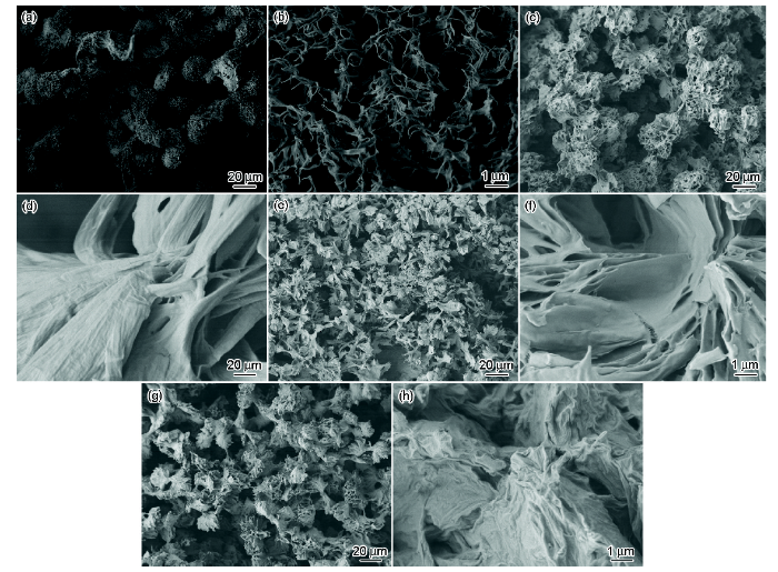 图2给出了ASA含量不同的PCL/ASA复合材料的SEM照片。从图2a,b可见,未添加ASA的纯PCL材料的基体由互相联结的球体结构构成,而球体结构的微观壁体结构由均匀的纳米纤维网络结构构成,其纤维直径约为50~300 nm。添加ASA后球体结构逐渐消失,纤维结构也发生了变化(图2c~h)。添加量为5%的复合材料其基体结构由原来球体结构变成了更为松散的球状结构,纳米纤维网络结构已经消失(图2c, d),取而代之的是微米级别以上的一些纤维网络结构。阿司匹林含量为10%(图2e, f)复合材料其球状基体结构基本消失,由一些花簇状的结构组成,在高倍电镜下基体不再是纤维结构,而是由一些片状结构组成,片的厚度仍为纳米级别。ASA含量达到15%的复合材料其基体结构由一些花簇状结构和部分团状结构构成,在高倍电镜下这些花簇状结构或团状结构不再是纤维结构或片状结构,而是由一些实壁结构构成(图2g, h)。由此可见,添加不同含量的ASA对PCL纳米纤维结构有重要的影响。其用意是,ASA作为小分子添加到复合体系中作为杂质影响了相分离过程PCL分子链的有序性,从而影响了相分离初期PCL微晶的形成和纳米纤维结构的形成。