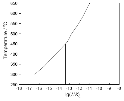 两种卷取温度将影响试验钢析出物的数量、大小及密度,因此分析了试验钢在两种卷取温度下析出物的析出行为。由于试验钢卷取温度分别为450℃和400℃,在此温度下试验钢已进入铁素体区域。因此计算了试验钢中(Nb,V)(C,N)在铁素体中析出动力学,了解其在卷取温度下的析出行为。(Nb,V)(C,N)在铁素体中的溶度积