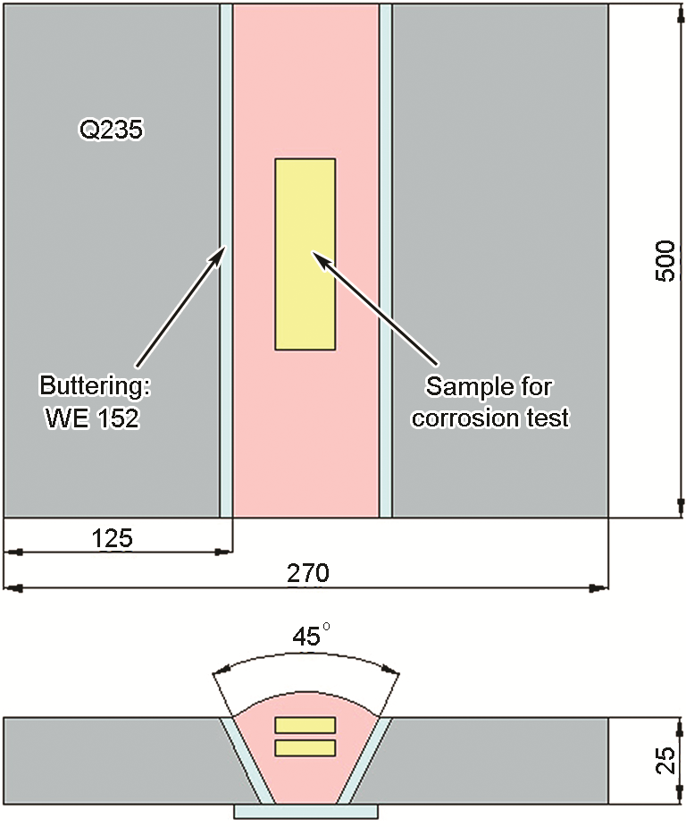 Fig.1 Schematic diagram of butt weldment and sampling location of corrosion test specimens (unit:mm) |