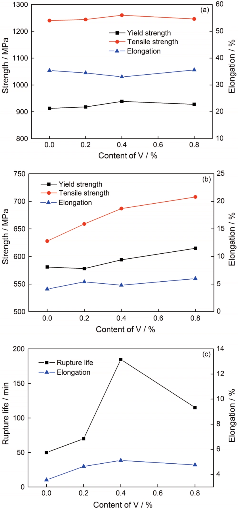 | Fig.9 Effects of V content on the mechanical properties of GH4061 alloy: (a) room temperature tensile, (b) 750℃ tensile and (c) 750℃/460 MPa rupture |