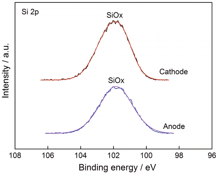 | 图5 阴极和阳极薄膜的XPS图谱中的 Si2p峰 |