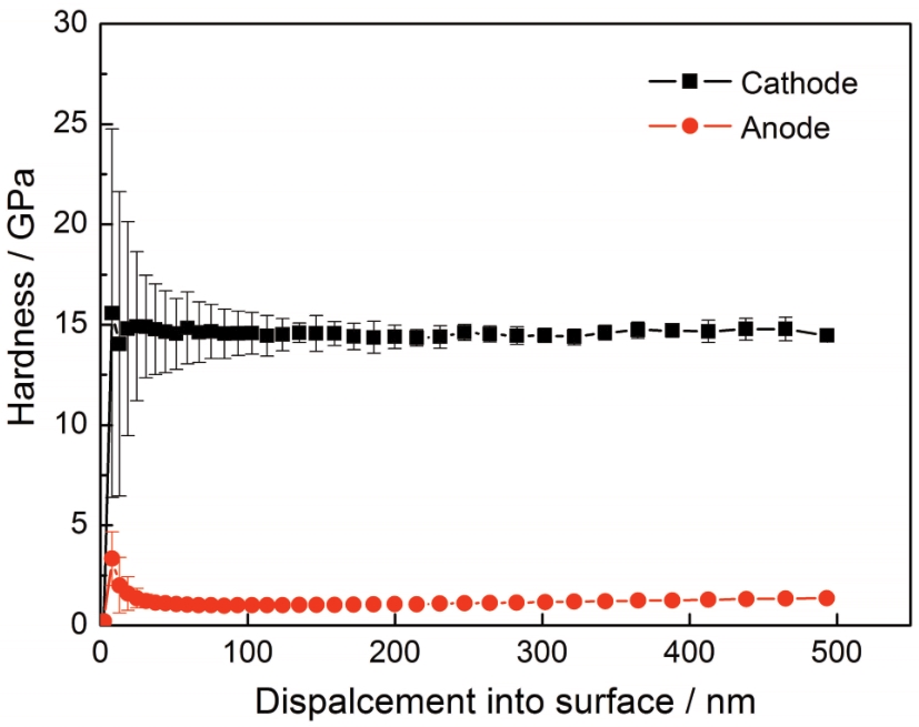 | 图7 阴极和阳极薄膜的纳米压痕测试结果 |