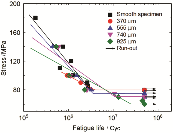 为了使经验公式更适用于Al-Si-Mg铝合金材料,更满足实际工程应用对铝合金高周疲劳强度的要求,基于含表面人工缺陷的Al-7Si-0.6Mg试样的疲劳试验结果(