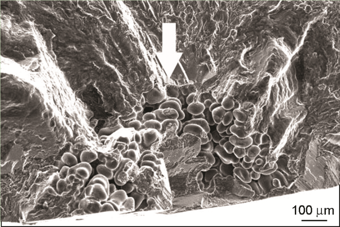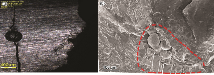 除了部分370 μm钻孔试样,其余钻孔试样的失效是人工缺陷萌生的裂纹引起的。而如图4b所示的370 μm钻孔试样,在断口中有两个裂纹源,但是未发现人工缺陷。进一步详细观察(图5a)发现,在人工缺陷处的确萌生了裂纹,即图4b中左上角裂纹。但是缺陷并未处于断口上,说明最终引起失效的裂纹并不是在人工缺陷处萌生。高倍观察发现,最终引起疲劳失效的萌生区如图5b所示。在试样次表层有一处铸造缺陷(气孔),尺寸约为