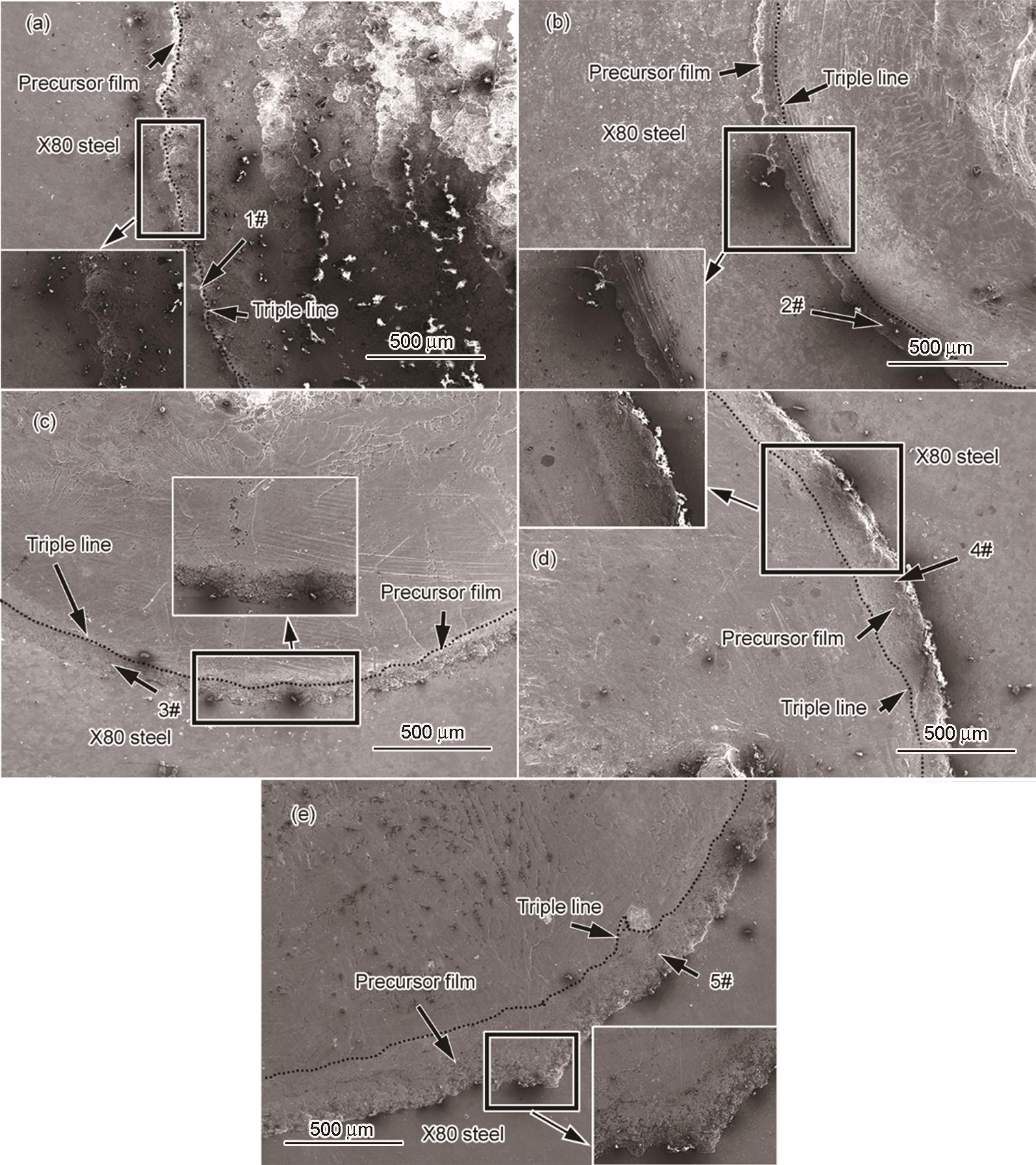 Fig.2 Wetting surface morphologies of Zn-xMn alloy melts and X80 steel, x= (a) 0.1%, (b) 0.2%, (c) 0.3%, (d) 0.4% and (e) 0.5% (mass fraction) |