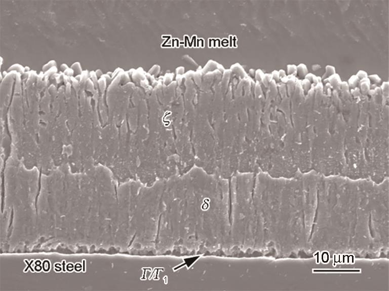 Fig.5 Microstructure of Zn-0.5%Mn (mass fraction) /X80 steel interface |