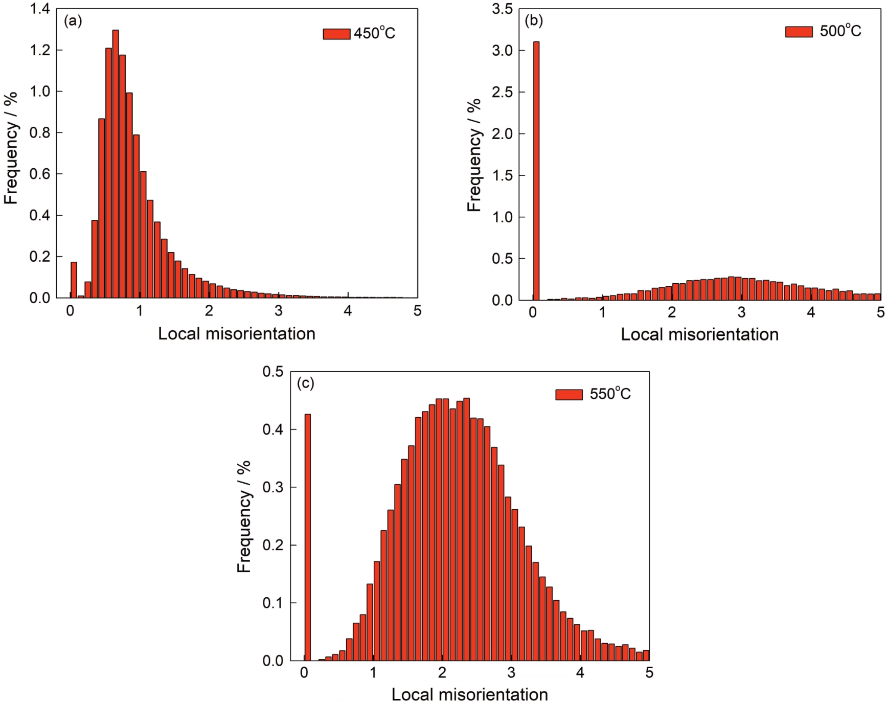 | Fig.8 KAM diagram of experimental steel after aging at different temperatures (a) aged at 450℃; (b) aged at 500℃; (c) aged at 550℃ |