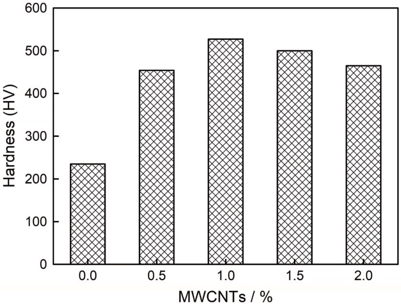 | Fig.7 Effect of additive amount of MWCNTs on the hardness of TiC reinforced titanium composites |