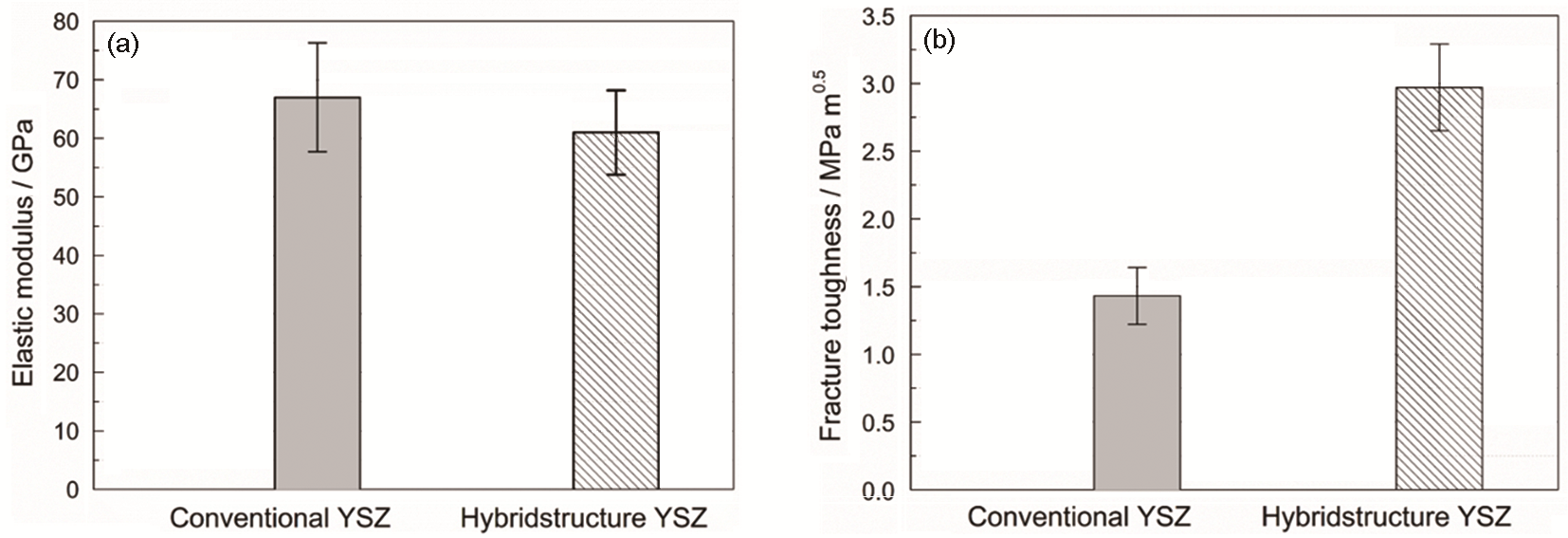 | Fig.5 A comparison of the elastic modulus (a) and fracture toughness (b) between conventional structured TBCs and hybrid-structured MCrAlY/8YSZ TBCs |