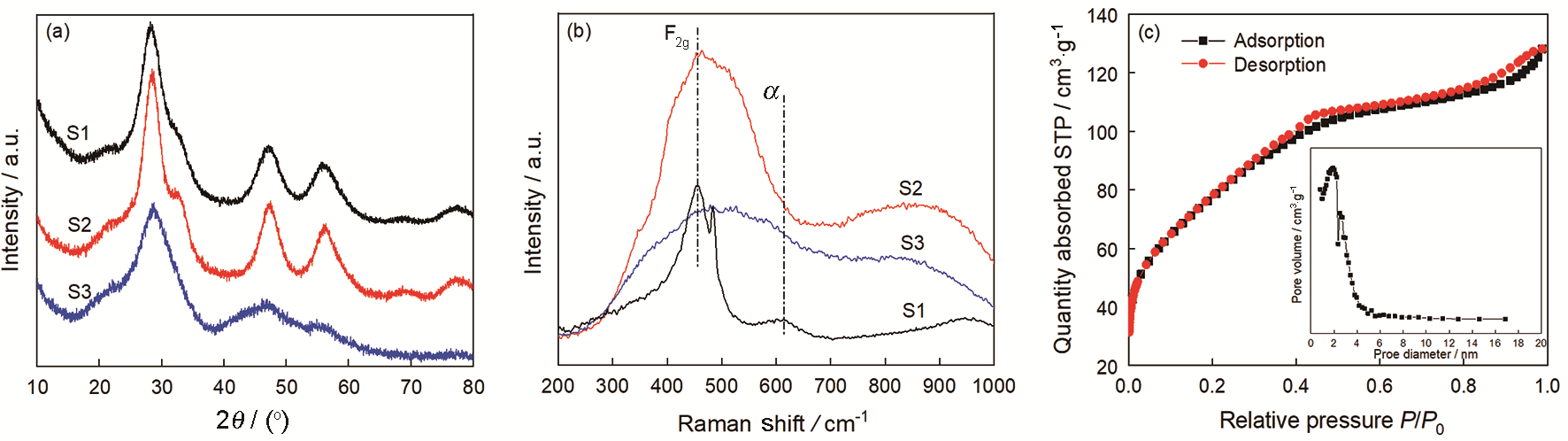 | 图3 复合颗粒样品的XRD、Raman图谱和氮气吸/脱附等温线 |