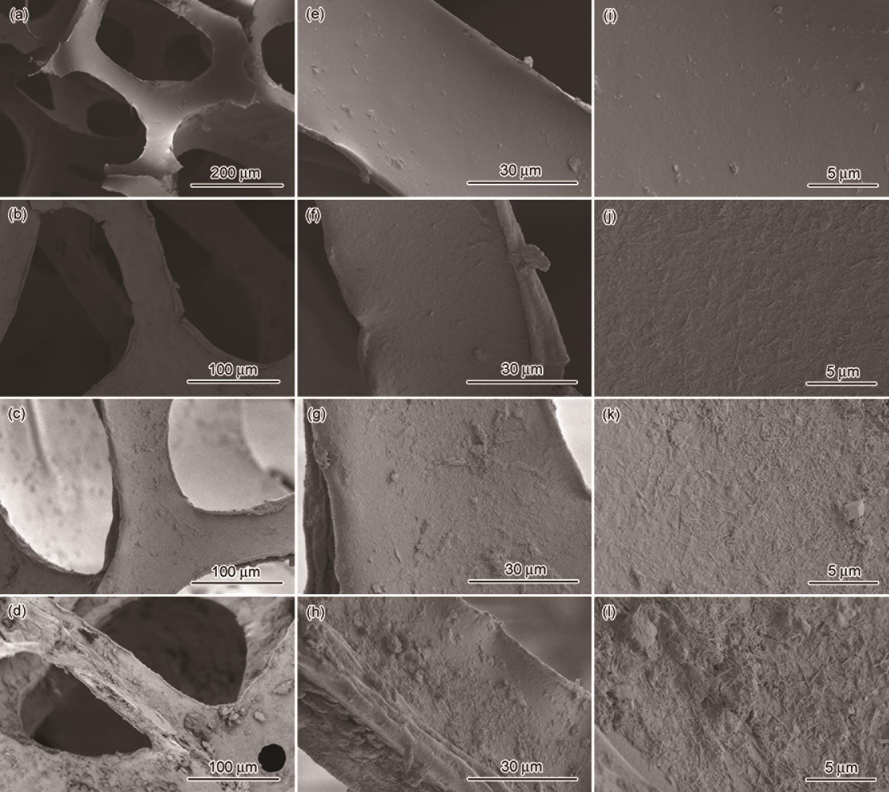 | Fig.2 SEM images of PU-0 (a, e, i), PU-1 (b, f, j), PU-2 (c, g, k) and PU-3 (d, h, l) |