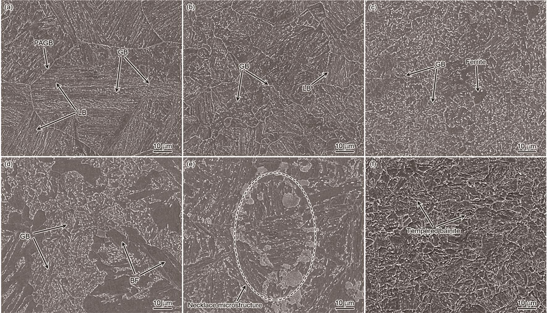| Fig.5 SEM images of various zones in upper weld metal (a) Melt zone (MZ), (b) Coarse grain heat affected zone (CGHAZ), (c) Fine grain heat affected zone (FGHAZ), (d) Inter-critical heat affected zone (ICHAZ), (e) Inter-critical coarse grain heat affected zone (ICCGHAZ), (f) Sub-critical heat affected zone (SCHAZ) |